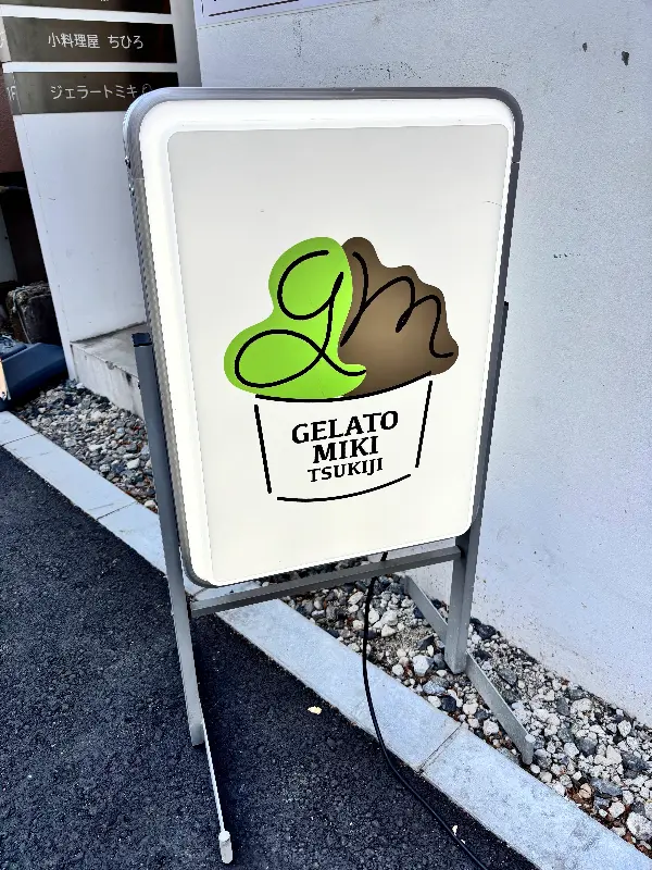 숨겨진 보석같은 젤라또 가게, 젤라또 미키 츠키지점의 입간판이 손님들을 맞이합니다.