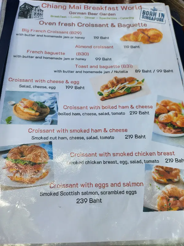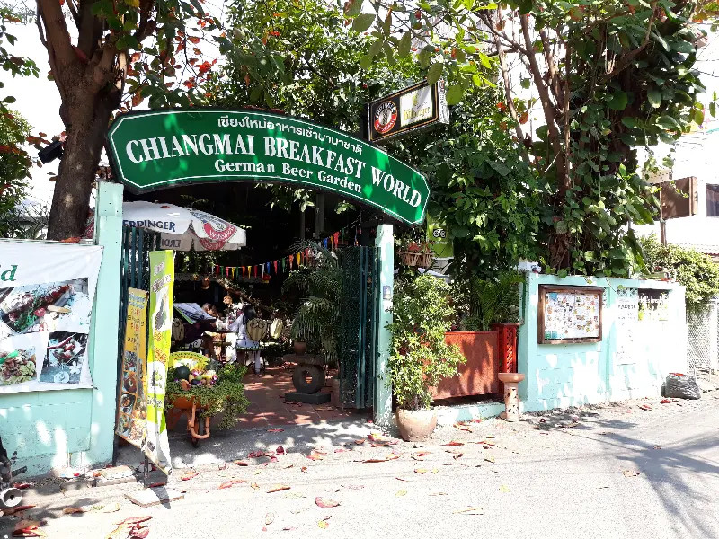 여행의 설렘을 가득 안고 치앙마이의 아침을 맞이했다. 낯선 골목길을 따라 발걸음을 옮기니, 마치 숨겨진 보석처럼 자리한 브런치 맛집 Chiangmai Breakfast World가 눈에 들어왔다. 초록색 간판에는 “Chiangmai Breakfast World”라는 글자와 함께 독일 맥주 정원이라는 문구가 적혀 있어 독특한 분위기를 자아냈다.