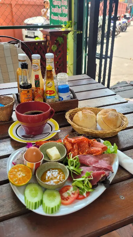 고민 끝에 아메리칸 브렉퍼스트 세트와 오믈렛을 주문했다. 음료는 라임주스와 아메리카노를 선택했다. 주문 후, 잠시 주변을 둘러보니 서양인들이 많이 눈에 띄었다. 마치 유럽의 어느 브런치 카페에 와 있는 듯한 착각이 들 정도였다.