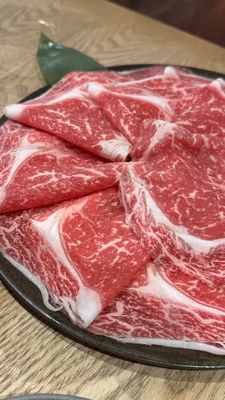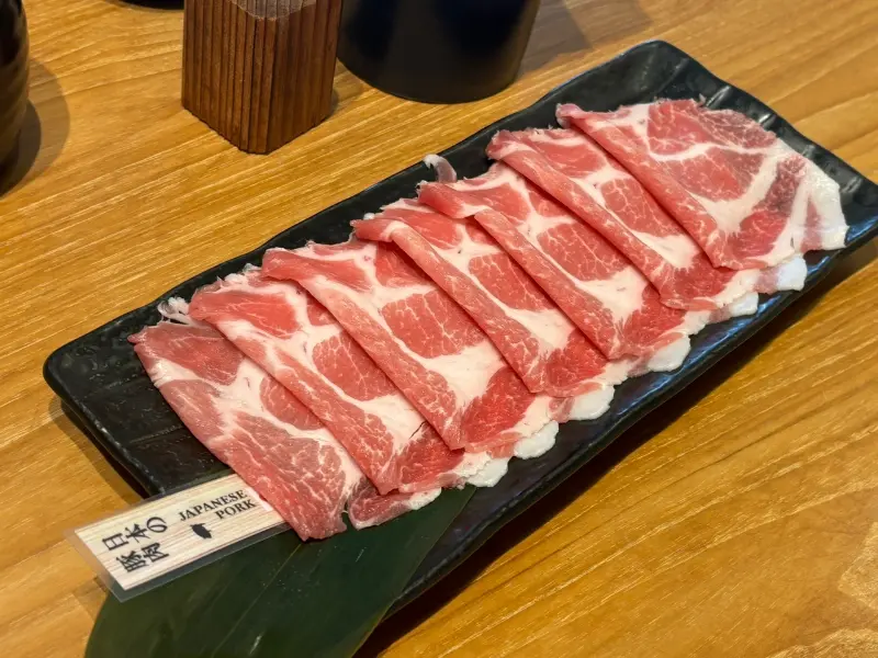 소고기뿐만 아니라 돼지고기 또한 뛰어난 퀄리티를 자랑합니다. 얇게 썰어낸 돼지고기는 샤브샤브로 즐기기에 안성맞춤입니다. 육질은 쫄깃하면서도 부드럽고, 풍부한 육즙은 입 안을 즐겁게 합니다. 일본산 돼지고기임을 인증하는 팻말은 신뢰감을 더합니다.