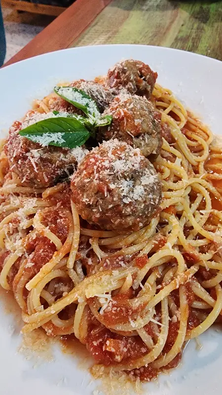 육즙 가득한 미트볼이 듬뿍 올라간 미트볼 파스타. 토마토 소스와 파마산 치즈의 조화가 환상적이다.