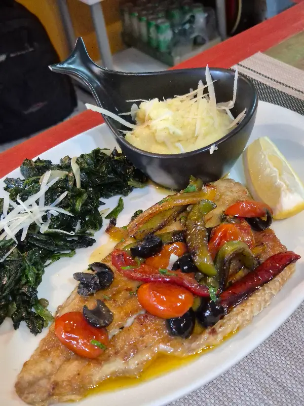 신선한 재료들이 듬뿍 올라간 생선 요리. 올리브와 토마토의 조화가 인상적이다.