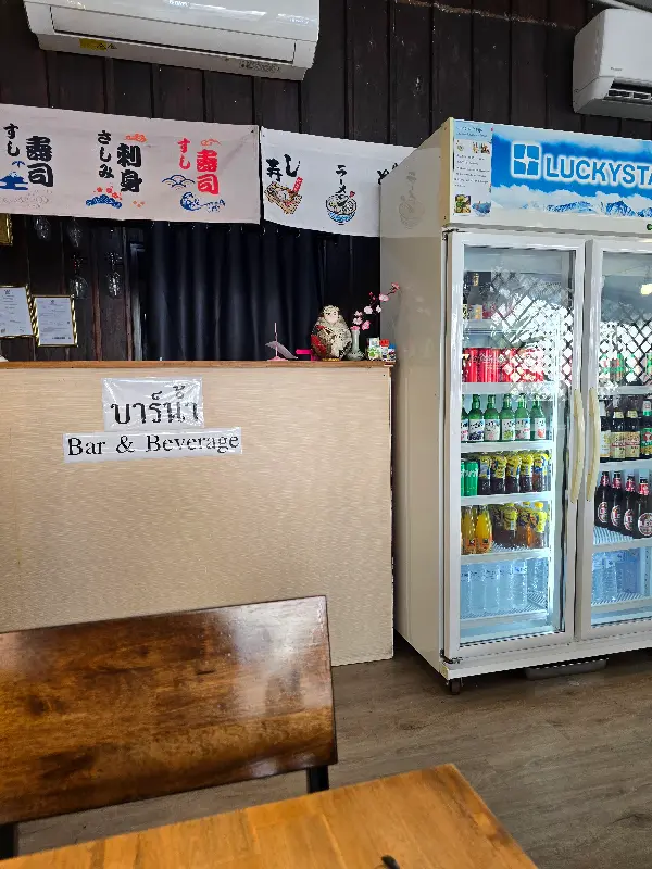 깔끔하게 정돈된 카운터와 음료 냉장고 모습. 일본풍 장식이 눈에 띈다.