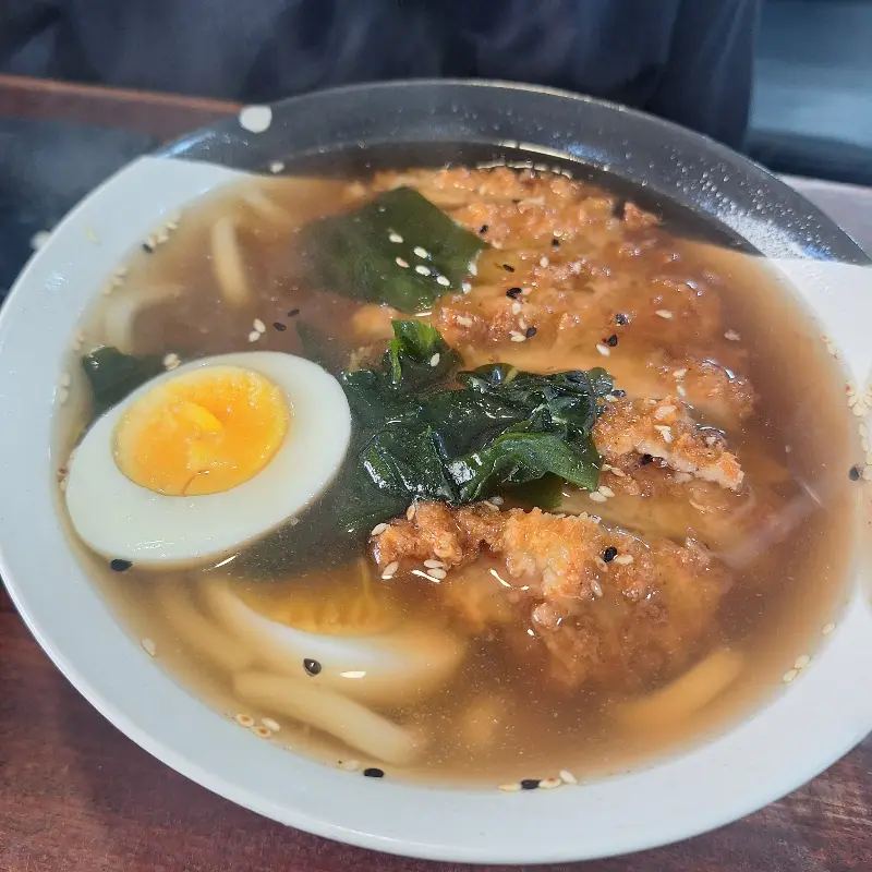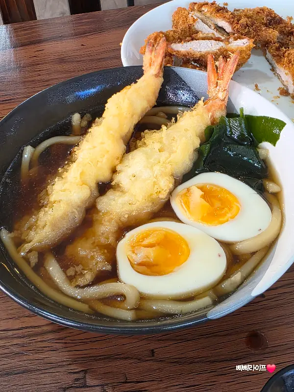 따뜻한 국물이 일품인 우동. 튀김과 해초, 반숙 계란이 어우러져 풍성한 맛을 낸다.