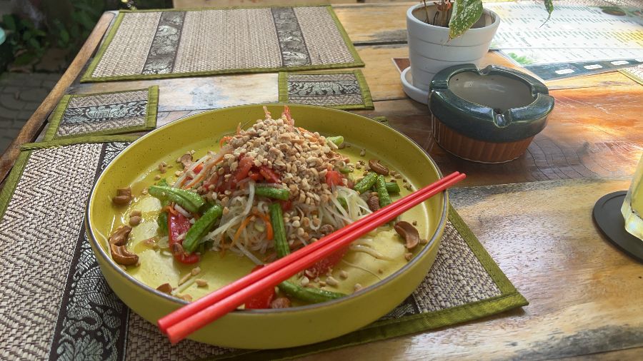 분위기만 좋은 곳이 아닙니다. Coco Homestay & Cocktail Bar는 음식의 맛에서도 단연 최고를 자랑합니다. 태국 전통 요리부터 다양한 퓨전 요리까지, 모든 메뉴는 신선한 재료와 정성으로 만들어져 깊은 풍미를 선사합니다. 특히 이곳의 카오 쏘이는 지난 8년간 치앙마이에서 먹어본 카오 쏘이 중 최고였다는 극찬을 받을 정도로 인상적입니다. 고소한 땅콩과 신선한 채소가 듬뿍 올라간 쏨땀은 입맛을 돋우는 완벽한 애피타이저이며, 한 입 베어 물면 태국의 진정한 맛을 느낄 수 있습니다.