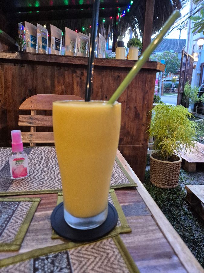 음식만큼이나 음료도 훌륭합니다. 과일이 듬뿍 들어간 거대한 망고 스무디는 달콤하고 시원하여 더운 날씨에 갈증을 해소하기에 안성맞춤입니다. 신선한 파인애플로 만든 스무디 역시 열대과일의 풍미를 가득 담아내어, 한 모금 마시는 순간 치앙마이의 뜨거운 태양 아래에서 시원한 휴식을 선사합니다. 이곳의 음료는 단순한 갈증 해소를 넘어, 미각을 깨우는 즐거운 경험이 됩니다.