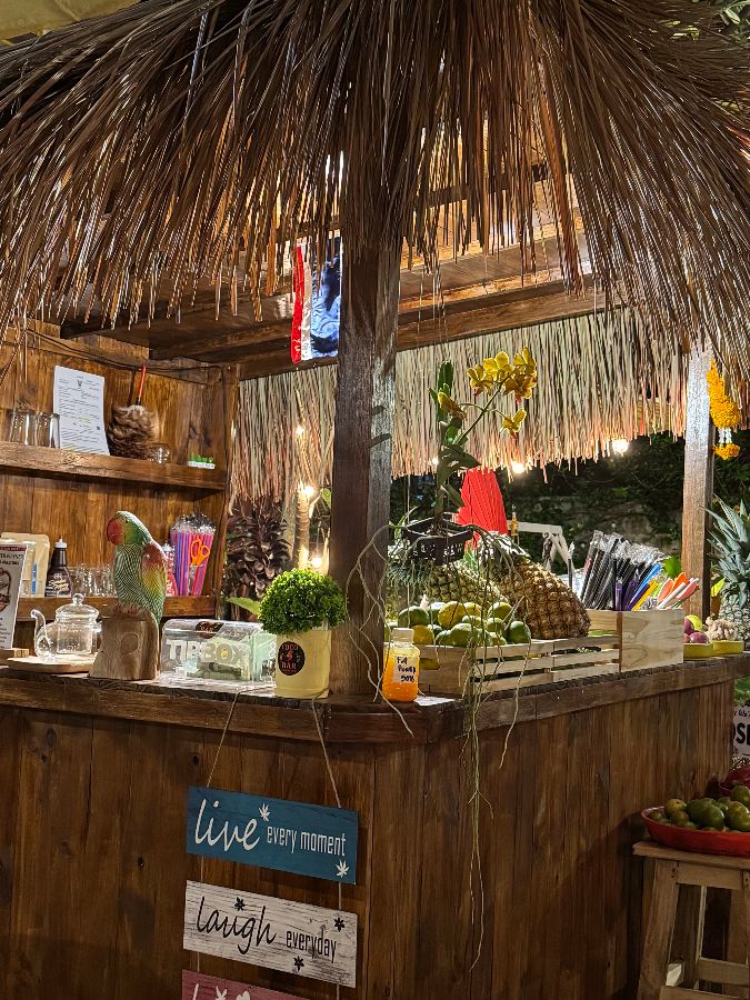바 테이블 위에는 신선한 과일들이 탐스럽게 놓여 있고, 그 뒤로 칵테일을 만드는 데 사용되는 다양한 음료병들이 가지런히 정돈되어 있습니다. ‘live every moment, laugh everyday’라는 문구는 이곳의 긍정적인 에너지를 대변하며, 방문객들에게 매 순간을 즐기라는 메시지를 전합니다. 이러한 디테일 하나하나가 모여 Coco Homestay & Cocktail Bar만의 편안하면서도 세련된, 완벽한 조화를 이룹니다.