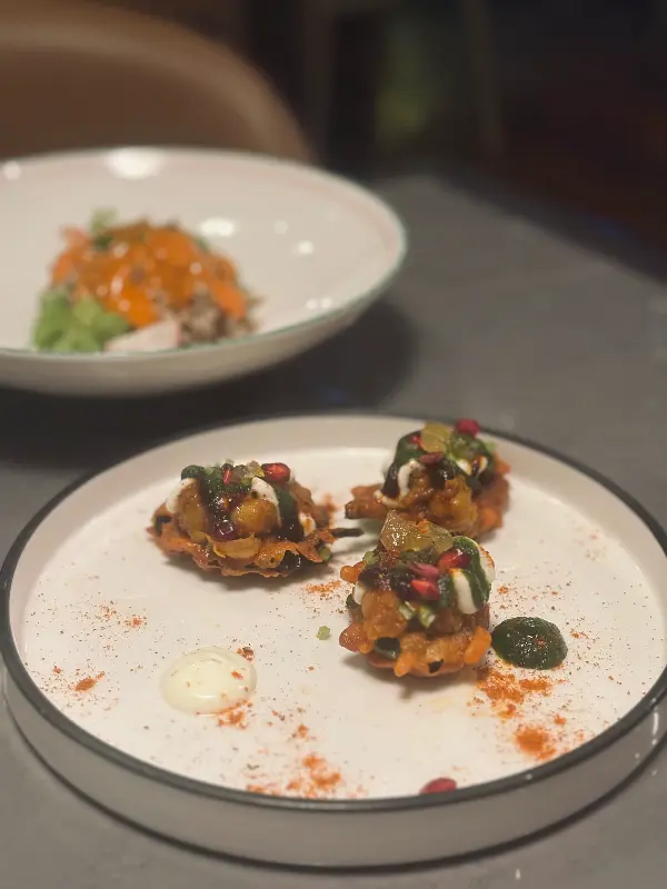 가장 먼저 맛본 것은 바삭한 시금치 튀김이었습니다. 얇게 튀겨진 시금치에 새콤달콤한 소스와 향긋한 향신료가 어우러져, 입안 가득 다채로운 풍미가 퍼져 나갔습니다. 특히 세 가지 소스의 조화가 인상적이었는데, 각각 다른 맛과 향이 시금치의 풍미를 더욱 돋보이게 했습니다.