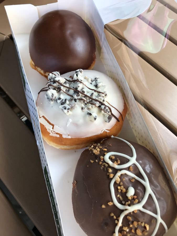 고민 끝에 너티 초콜릿 도넛과 새로 나왔다는 허쉬 쿠키 앤 크림 도넛을 주문했다. 진열장 너머로 보이는 도넛들의 자태는, 마치 예술 작품을 감상하는 듯한 기분마저 들게 했다.