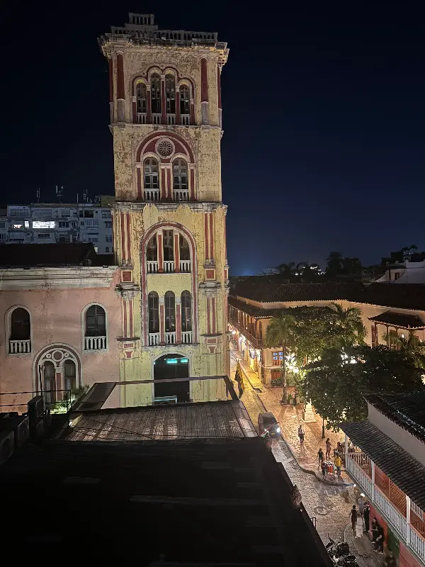 루프탑에 올라서니 시원한 바람이 기분 좋게 불어옵니다. 눈 앞에 펼쳐진 카르타헤나의 야경은 탄성을 자아낼 만큼 아름답습니다. 붉게 물든 하늘과 고풍스러운 건물들이 어우러져 그림 같은 풍경을 만들어냅니다. 이런 멋진 야경을 바라보며 맛있는 음식을 즐길 수 있다니, 정말 꿈만 같습니다.