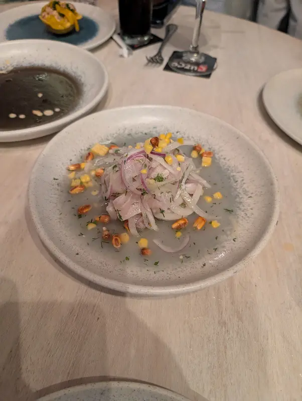 잠시 후, 테이블 위로 화려한 색감을 자랑하는 세비체가 등장했다. 신선한 해산물과 아삭한 채소들이 타이거스 밀크에 절여진 모습은 보기만 해도 입안에 침이 고이게 했다. 첫 입을 맛보는 순간, 감탄사가 절로 나왔다. 신선한 해산물의 풍미와 새콤하면서도 매콤한 타이거스 밀크의 조화는 그야말로 환상적이었다. 32도의 더운 날씨에도 불구하고, 입안 가득 퍼지는 신선함 덕분에 더위가 싹 가시는 듯했다.