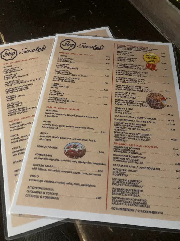 Stop Souvlaki는 카마리 해변 바로 앞에 위치해 있어 접근성이 뛰어나다. 가게 안으로 들어서자 활기 넘치는 분위기가 느껴졌다. 메뉴판을 펼쳐 보니 다양한 그리스 전통 음식이 눈에 띄었다. 수블라키는 물론, 자이로, 폴페타 등 이름만 들어도 군침이 도는 메뉴들이 가득했다. 고민 끝에 가장 유명하다는 돼지 기로스와 수블라키를 주문했다. 주문을 마치고 가게를 둘러보니, 벽에는 CNN에 소개된 내용과 방문객들의 사진이 빼곡하게 붙어 있었다. 그들의 만족스러운 표정을 보니 음식에 대한 기대감이 더욱 커졌다.