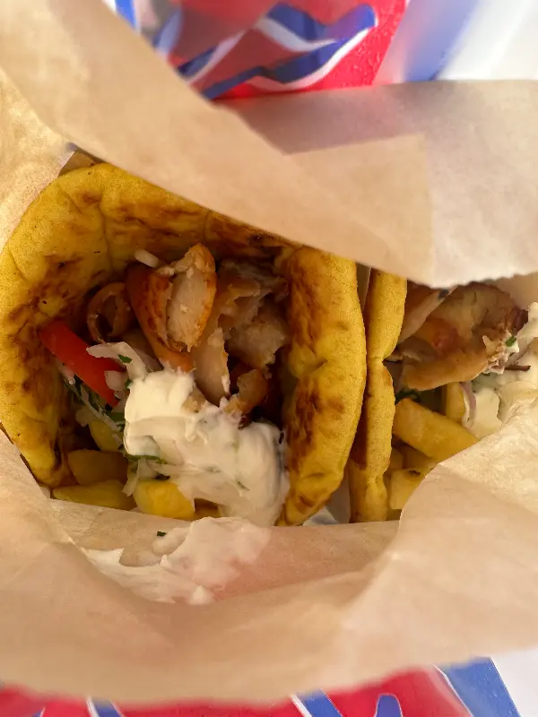 잠시 후, 기다리고 기다리던 돼지 기로스가 나왔다. 종이 포장지에 담겨 나온 기로스는 겉으로 보기에도 푸짐해 보였다. 포장지를 열자 따뜻한 김과 함께 맛있는 냄새가 코를 자극했다. 노릇하게 구워진 피타 빵 안에는 짭짤한 돼지고기, 신선한 야채, 그리고 부드러운 소스가 듬뿍 들어 있었다. 한 입 베어 무니, 입안 가득 퍼지는 풍미가 환상적이었다. 짭짤한 돼지고기와 신선한 야채, 그리고 소스의 조화가 완벽했다. 특히, 피타 빵은 겉은 바삭하고 속은 촉촉해서 기로스의 맛을 한층 더 살려주었다.
