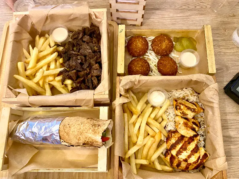 고민 끝에 샤와르마 치킨, 카프타, 그리고 파투쉬를 주문했다. 잠시 후, 테이블 위에는 먹음직스러운 음식들이 가득 차려졌다. 화려한 색감과 신선한 재료들이 시각적인 즐거움을 선사했고, 코를 찌르는 향신료의 향은 식욕을 자극했다.