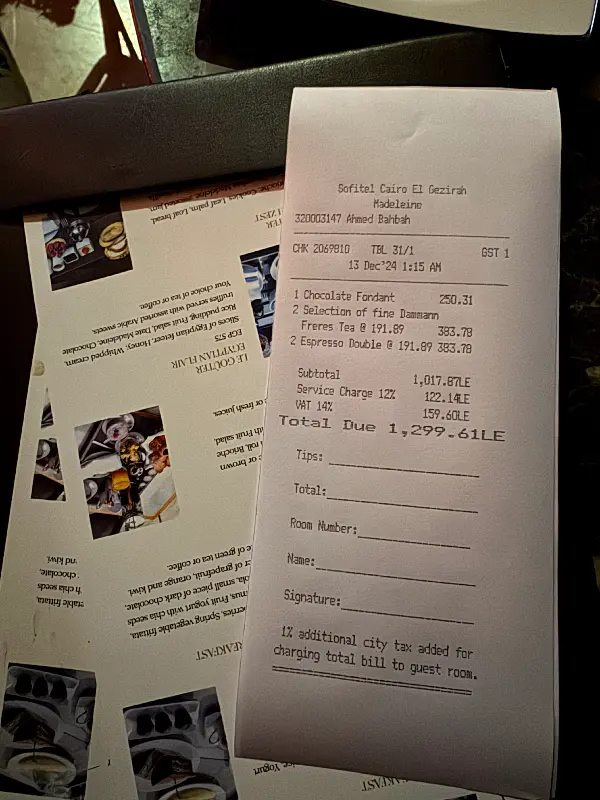 Sofitel Cairo El Gezirah는 카이로 여행 중 꼭 방문해야 할 명소 중 하나입니다. 나일강의 아름다운 풍경을 감상하며 맛있는 음식을 즐기고, 특별한 추억을 만들 수 있는 곳입니다. 느린 서비스와 높은 가격은 다소 아쉽지만, 훌륭한 분위기와 음식, 그리고 친절한 서비스는 그 모든 것을 잊게 할 만큼 매력적입니다.
