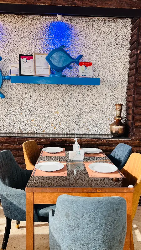 깔끔하게 정돈된 테이블과 편안한 의자가 인상적인 내부 모습입니다. 벽면에 장식된 푸른색 물고기 조형물이 해산물 레스토랑의 분위기를 더욱 살려줍니다.