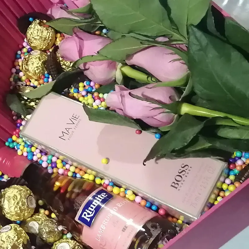 핑크빛 장미와 달콤한 초콜릿, 향수까지 더해진 선물 세트. 특별한 날, 사랑하는 사람에게 마음을 전하기에 완벽한 구성입니다.
