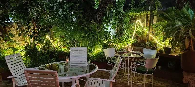 레스토랑 내부는 따뜻하고 아늑한 분위기로 가득합니다. 마치 프랑스 가정집에 초대받은 듯한 편안함이 느껴집니다. 테이블 위에는 붉은색 체크무늬 식탁보가 깔려 있고, 벽에는 프랑스의 풍경을 담은 그림들이 걸려 있습니다. 은은한 조명 아래, 연인들은 속삭이며 데이트를 즐기고, 가족들은 웃음꽃을 피우며 즐거운 시간을 보내는 모습이 눈에 들어옵니다. 고급스러우면서도 편안한 분위기는 L’Escargot만의 매력입니다. 사진에서 보이는 야외 테라스는 마치 유럽의 작은 정원을 연상시키며, 낭만적인 분위기를 더합니다. 칸쿤의 열대 기후 속에서 시원한 바람을 맞으며 즐기는 프랑스 요리는 특별한 경험이 될 것입니다.