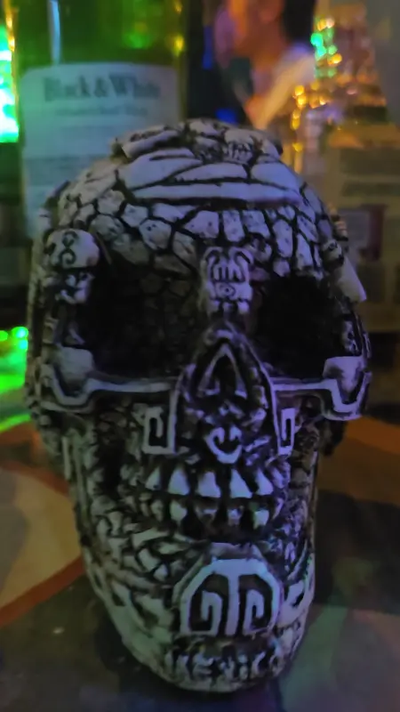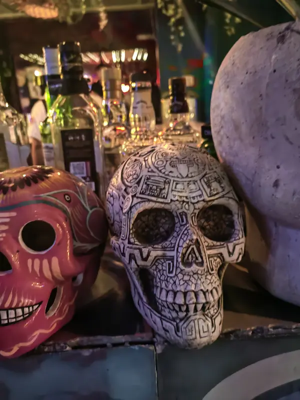 La Coyota는 첫인상부터 강렬합니다. 네온사인으로 빛나는 가게 이름 아래, 이국적인 장식들이 시선을 사로잡습니다. 천장에는 나뭇가지와 잎사귀들이 드리워져 자연 속에 있는 듯한 느낌을 주고, 은은한 조명은 공간을 더욱 아늑하게 만들어 줍니다. 바 테이블 위에는 해골 모형이 놓여 있어 멕시코 특유의 분위기를 더합니다.