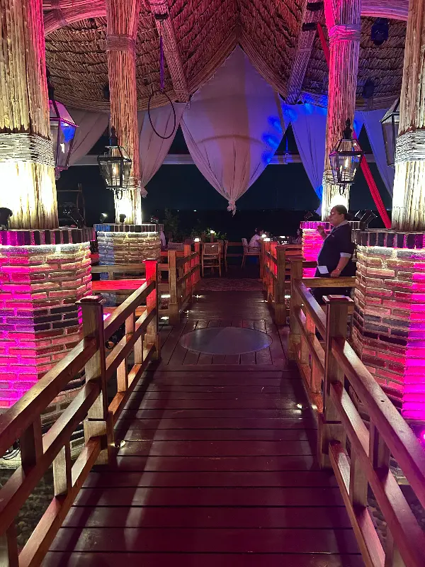 예약을 통해 평일 저녁에 방문했음에도 불구하고, 료시에서는 바다가 내려다보이는 최고의 자리를 안내받을 수 있었습니다. 잔잔하게 빛나는 칸쿤의 밤바다와 따뜻한 조명이 어우러진 풍경은 그 자체로 한 폭의 그림과 같습니다. 마치 바다 위에 떠 있는 듯한 레스토랑의 독특한 구조는 더욱 낭만적인 분위기를 자아냅니다.
