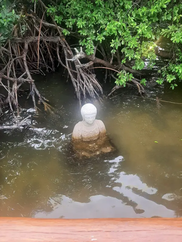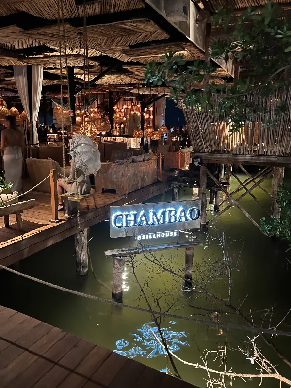 레스토랑은 마치 물 위에 떠 있는 듯한 독특한 구조로 되어 있다. 나무 데크를 따라 걸으며 주변 풍경을 감상하는 것만으로도 충분히 즐겁다. 천장에는 라탄 소재의 조명이 은은하게 빛나고, 곳곳에 놓인 예술 작품들은 챔바오만의 개성을 드러낸다. 특히 입구에서부터 보이는 ‘CHAMBAO’ 네온사인은 사진을 찍기에 완벽한 배경이 된다.