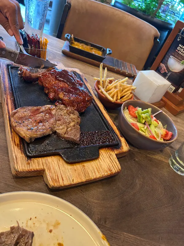 뜨거운 철판 위에서 지글거리는 스테이크와 구운 새우, 감칠맛을 더하는 гарнир의 조화가 완벽합니다.