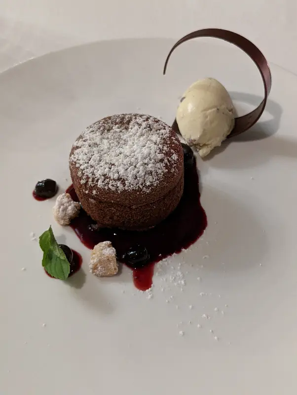 마지막으로 등장한 따뜻한 초콜릿 퐁당은 완벽한 마무리였다. 따뜻한 초콜릿 퐁당은 겉은 바삭하고 속은 촉촉했으며, 달콤한 초콜릿은 입안 가득 행복을 선사했다. 특히 초콜릿 퐁당과 함께 제공된 아이스크림은 시원하면서도 달콤했고, 초콜릿 퐁당의 따뜻함과 완벽한 대비를 이루었다.