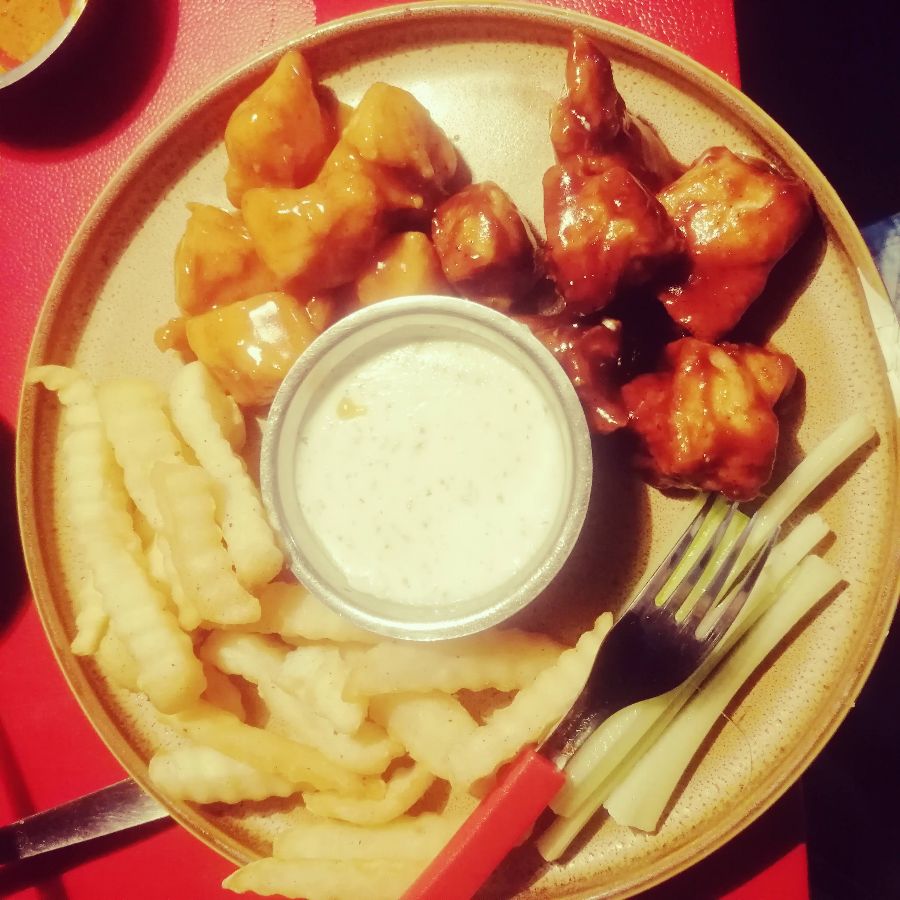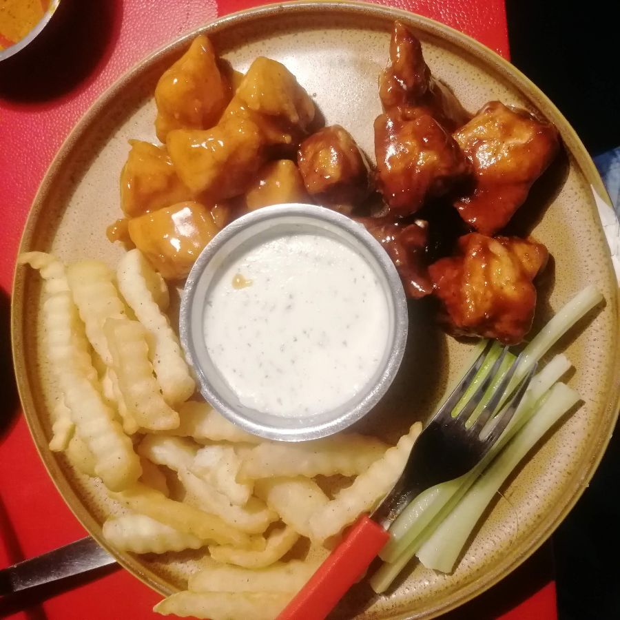 핫도그 역시 범상치 않았습니다. 커다란 소시지 위에 다채로운 토핑이 얹어져 보기만 해도 군침이 돌았고, 함께 나온 감자튀김은 겉바속촉의 정석을 보여주는 듯했습니다. 특히, 뼈 없는 윙은 매콤달콤한 소스를 머금고 윤기 있게 빛나고 있었는데, 얇게 뿌려진 치즈 가루는 고소함을 더하며 특별한 맛의 조합을 예고했습니다.