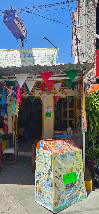 칸쿤에서의 첫날밤, 낯선 도시의 설렘과 함께 맛있는 저녁 식사를 기대하며 ‘Guru Tacos’의 문을 열었습니다. 칸쿤 시내의 작은 골목에 자리 잡은 이곳은, 화려한 간판 대신 소박하고 정겨운 분위기로 여행자를 맞이합니다. 멕시코 국기가 바람에 흩날리고, 알록달록한 장식들이 흥겨움을 더하는 외관은, 마치 영화 속 한 장면처럼 다가왔습니다.