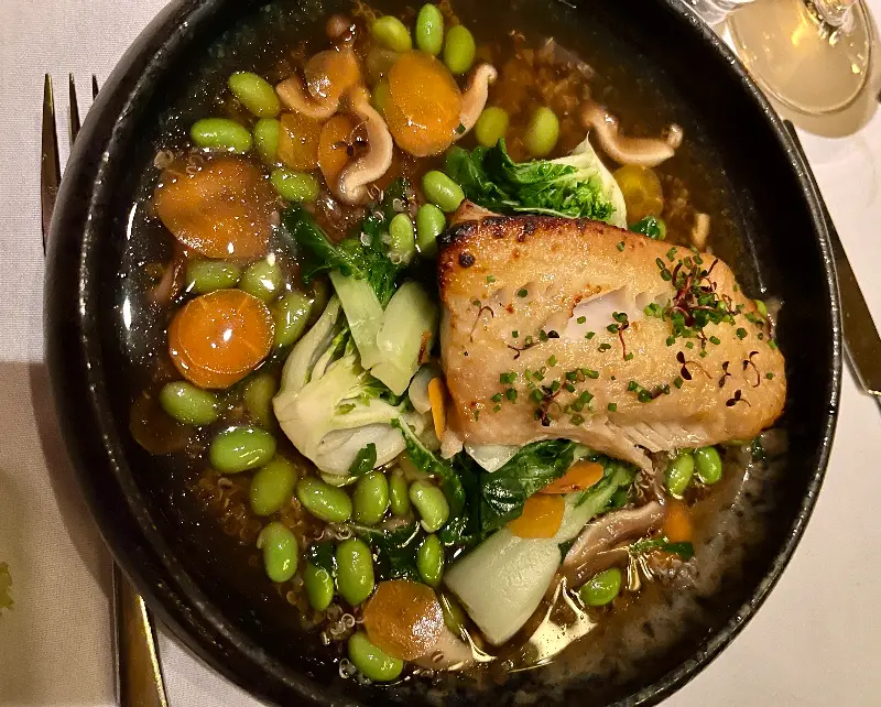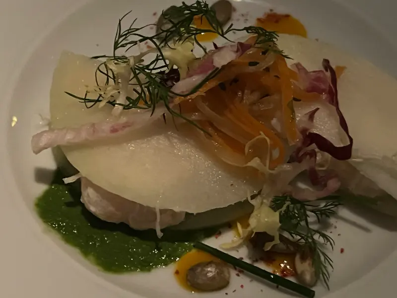 가장 먼저 나온 요리는 가리비가 들어간 세비체였다. 신선한 가리비의 쫄깃한 식감과 상큼한 소스가 어우러져 입맛을 돋우었다. 이어서 나온 해파리 요리는 독특한 식감과 풍미가 인상적이었다. 독일, 프랑스, 일본 셰프들의 협업으로 탄생한 창의적인 요리라는 설명처럼, 기존에 맛보던 해산물 요리와는 차원이 다른 맛이었다.