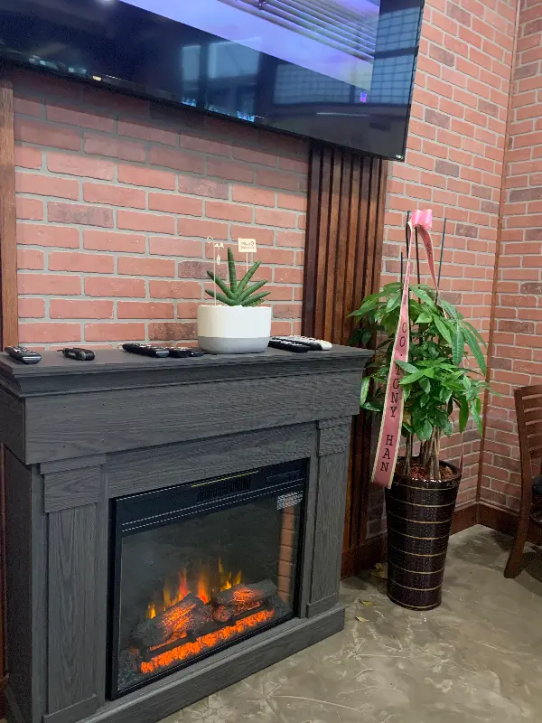 벽돌로 마감된 벽과 벽난로 장식이 따뜻하고 편안한 분위기를 자아낸다.