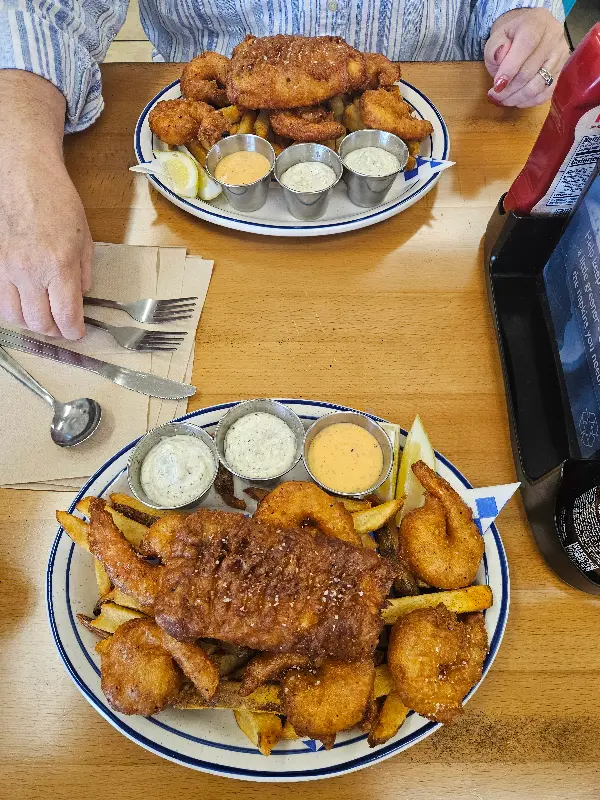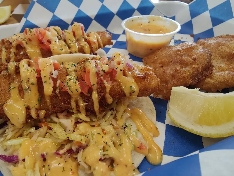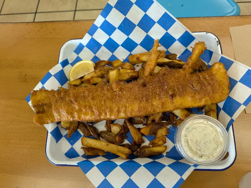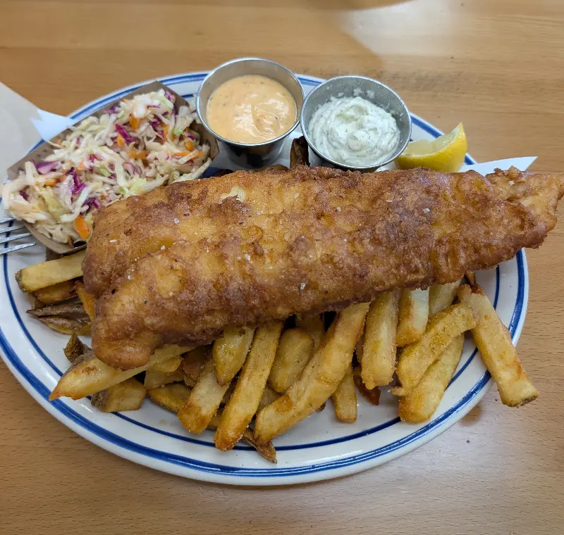 농어 피시 앤 칩스와 클램 차우더를 맛보았는데, 클램 차우더는 질감이 약간 묽었지만 맛은 괜찮았습니다. 하지만 농어는 튀김 자체만으로는 약간 심심하게 느껴질 수 있습니다. 그러나 걱정 마세요! Salty Blue에는 환상적인 타르타르 소스와 치폴레 소스가 준비되어 있습니다.