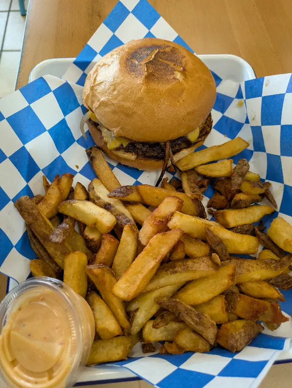 Salty Blue의 버거는 육즙이 풍부하고 맛있으며, 신선한 감자튀김과 함께 제공됩니다.