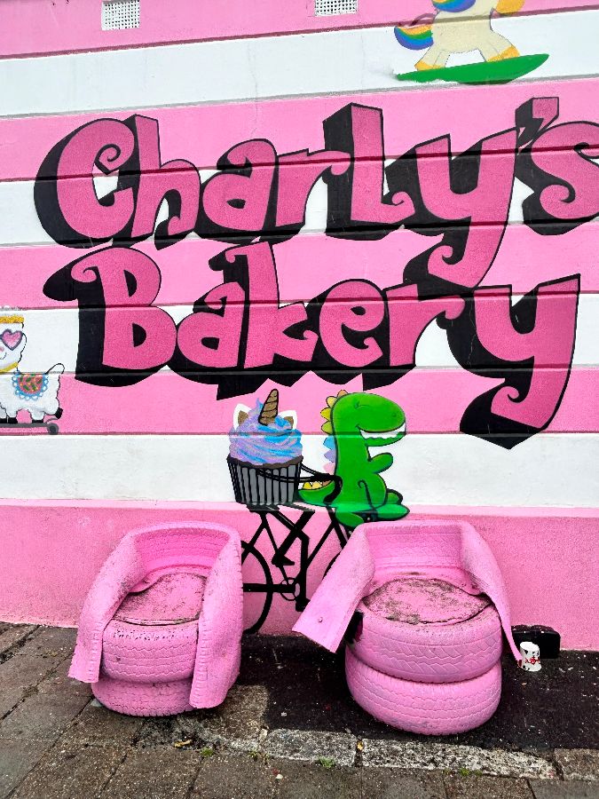 베이커리에 도착했을 때, 가장 먼저 눈에 띈 것은 강렬한 핑크색 외관이었습니다. 마치 거대한 케이크 상자를 연상시키는 외관은 사진에서 보던 것보다 훨씬 더 인상적이었습니다. 벽면에는 익살스러운 그림들과 Charly’s Bakery라는 상호명이 큼지막하게 적혀 있어, 이곳이 평범한 빵집이 아니라는 것을 단번에 알 수 있었습니다. 외관부터 느껴지는 독특한 분위기에 매료되어, 문을 열고 안으로 들어서는 순간 더욱 놀라운 광경이 펼쳐졌습니다.
