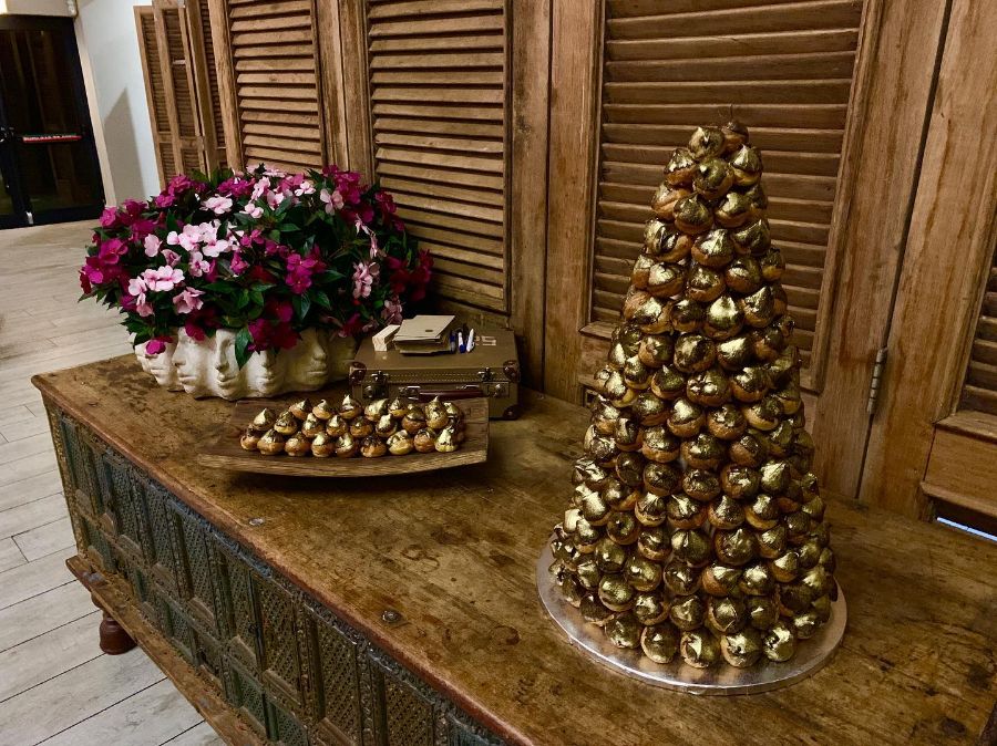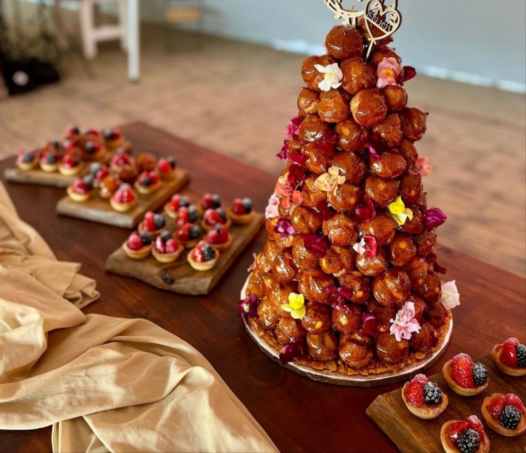 층층이 쌓아 올린 슈들이 캐러멜 시럽으로 굳혀져 하나의 탑을 이루고, 그 위에 싱그러운 식용 꽃과 달콤한 그라나딜라 크림이 더해진 크로캉부슈는 시각적으로도 황홀함을 선사합니다. 크로캉부슈 주변에 가지런히 놓인 산딸기, 블루베리, 블랙베리 등의 다채로운 베리류로 장식된 미니 타르트들은 전체적인 디저트 테이블을 더욱 풍성하게 만들어주며, 달콤함과 상큼함의 조화로운 미학을 완성합니다.
