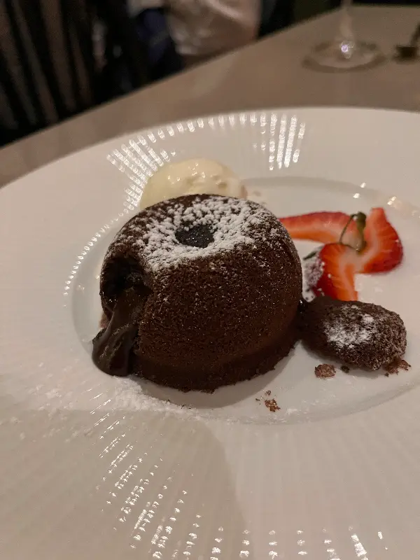 디저트로는 초콜릿 퐁당을 주문했다. 따뜻한 초콜릿 케이크에서 흘러나오는 진한 초콜릿은 달콤한 유혹이었다. 곁들여 나온 아이스크림과 딸기는 상큼함을 더했다. 마지막 한 입까지 완벽한 식사였다.