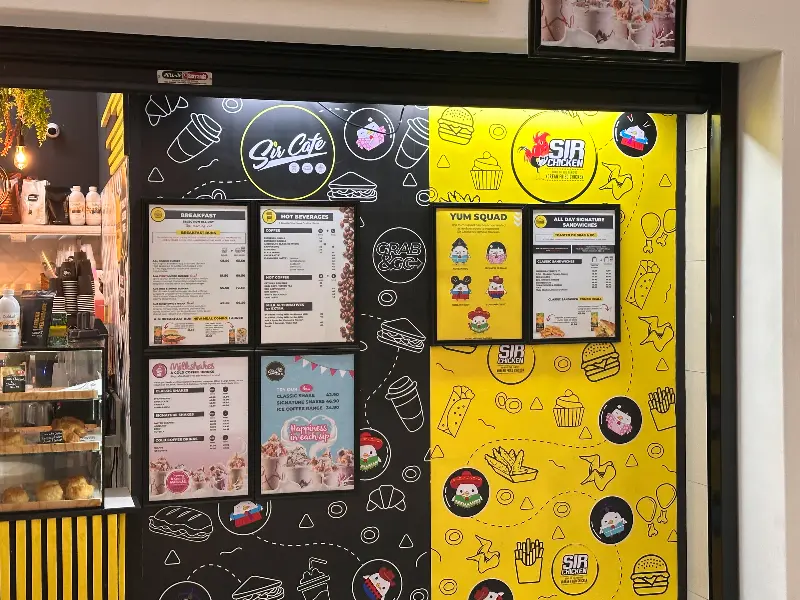써 치킨의 외관은 독특한 디자인으로 시선을 사로잡습니다. 한쪽 벽면은 칠판처럼 검은색으로 덮여 있고, 다른 한쪽은 밝은 노란색으로 칠해져 있습니다. 벽에는 다양한 메뉴와 귀여운 캐릭터 그림이 그려져 있어 보는 재미를 더합니다.