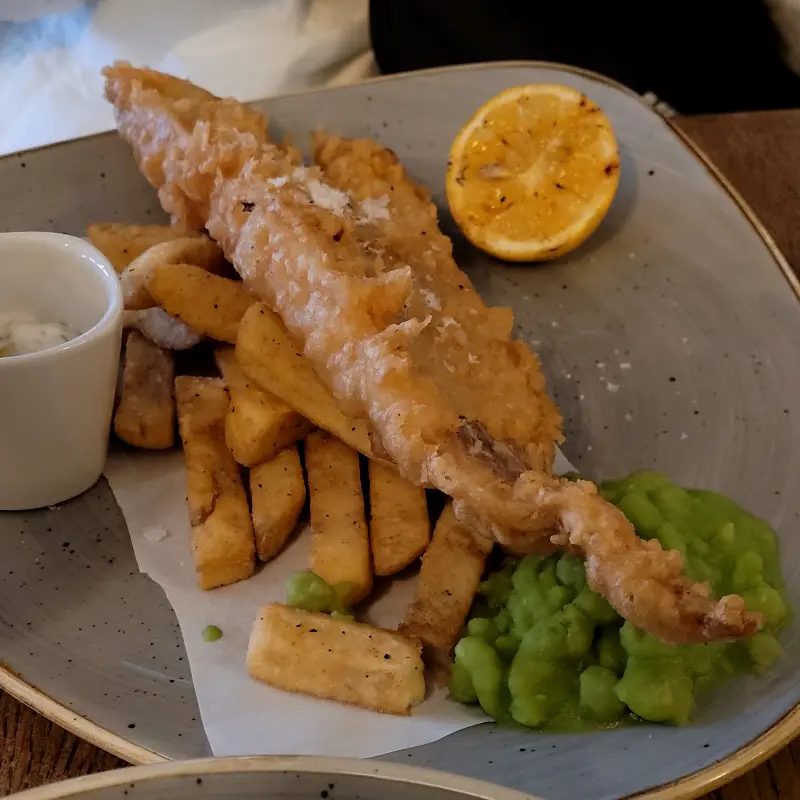 맥주가 간절했던 나는 망설임 없이 기네스를 주문했다. 묵직한 거품과 깊고 진한 향이 코를 간지럽혔다. 한 모금 들이키니 쌉싸름하면서도 부드러운 풍미가 입안 가득 퍼져 나갔다. 이대로는 아쉽다는 생각에 메뉴판을 둘러보던 중, 눈에 띈 것은 바로 피시 앤 칩스. 9시 주방 마감 직전이라 서둘러 주문했다.