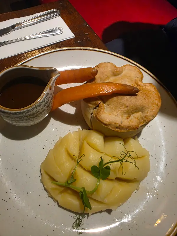 선데이 로스트와 매쉬 포테이토, 구운 당근의 조화. 촉촉한 매쉬 포테이토 위에 짭짤한 그레이비 소스를 듬뿍 뿌려 먹으면 환상적인 맛을 느낄 수 있다.