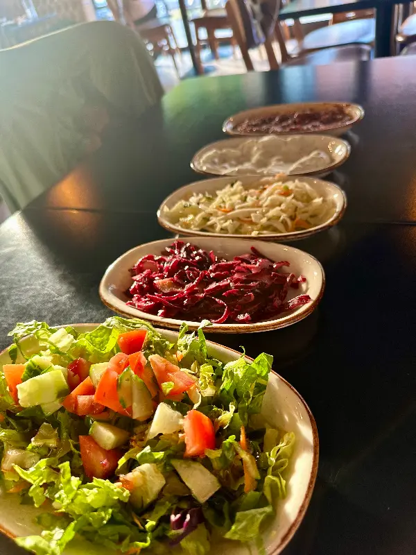 잘 구워진 꼬치와 신선한 샐러드. 맛은 괜찮았지만, 서비스는 아쉬웠다.