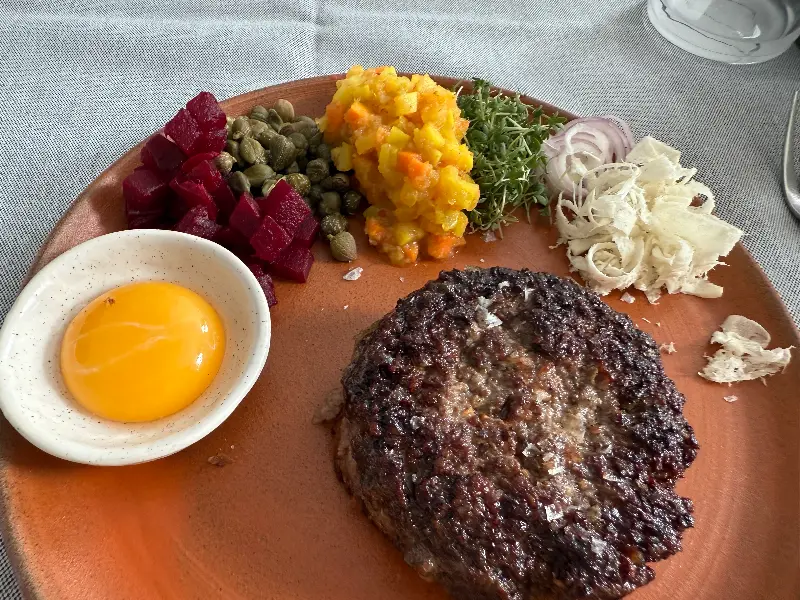 코에포에드(Koefoed)에서는 예상치 못한 재료들의 조화를 통해 놀라운 맛을 경험할 수 있습니다. 특히 로스트비프와 닭껍질을 곁들인 버터브레드는 이곳에서만 맛볼 수 있는 특별한 메뉴입니다. 완벽하게 구워진 로스트비프는 입안에서 부드럽게 녹아내리고, 바삭한 닭껍질은 고소한 풍미를 더합니다.