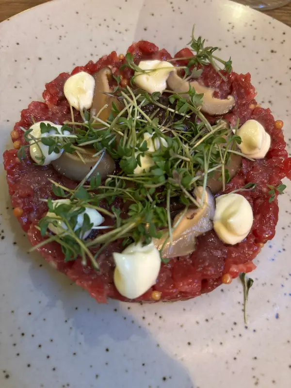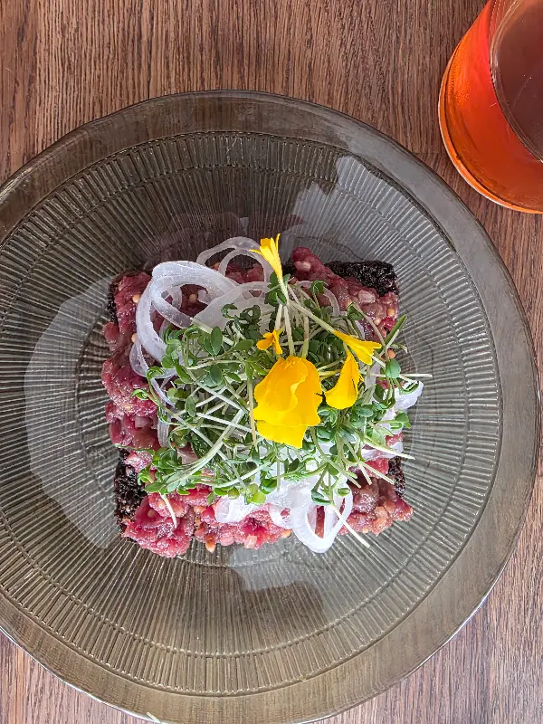저녁 식사로 3코스 메뉴를 선택했는데, 그중에서도 소고기 타르타르는 잊을 수 없는 맛이었습니다. 부드러운 소고기의 질감과 신선한 채소, 그리고 소스의 조화가 환상적이었죠. 입에 넣는 순간, 입 안 가득 퍼지는 풍미는 감탄을 자아내게 했습니다. 함께 제공된 빵에 올려 먹으니 그 맛이 더욱 풍성해지는 느낌이었어요.