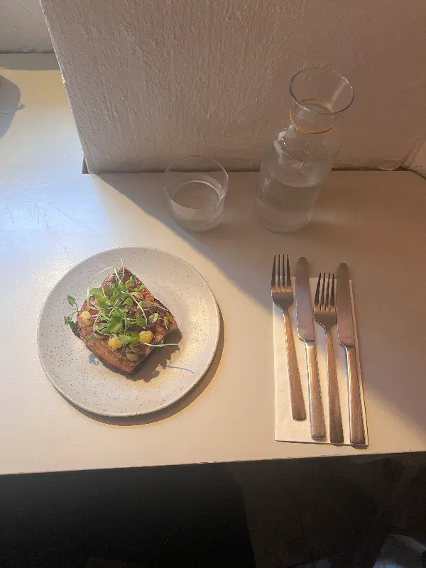 코펜하겐에 왔으니 스뫼레브뢰드를 빼놓을 수 없겠죠? 창가 자리에 앉아 주문한 스뫼레브뢰드는 기대 이상이었습니다. 신선한 재료들의 조화로운 맛은 물론이고, 보기에도 아름다운 플레이팅이 눈을 즐겁게 했습니다. 특히 인상적이었던 건 탄산수였어요. 평소 탄산수를 즐겨 마시는 저에게 노를리스트의 탄산수는 그야말로 ‘인생 탄산수’였습니다. 톡 쏘는 탄산과 청량감이 더해져, 스뫼레브뢰드의 풍미를 한층 더 끌어올려주는 느낌이었죠.
