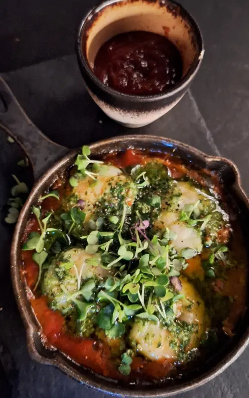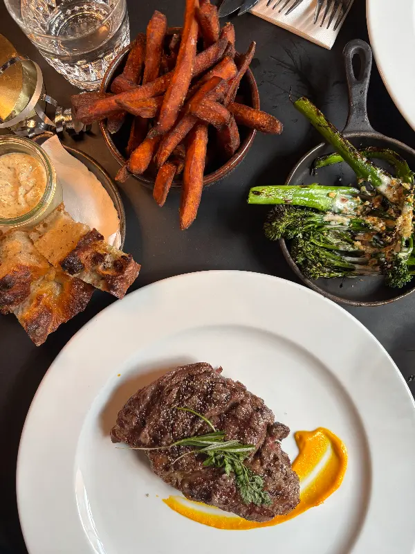 스테이크를 맛보기 전, 전채 요리로 갈릭 스캠피를 주문했다. 따뜻하게 구워진 스캠피는 마늘 향과 허브 향이 은은하게 퍼져 나왔다. 입에 넣으니 쫄깃한 식감과 함께 고소한 맛이 느껴졌다. 메인 요리를 즐기기 전에 입맛을 돋우는 데 완벽한 선택이었다. 사진 속 스캠피는 작은 팬에 담겨 나와 더욱 먹음직스러워 보인다.