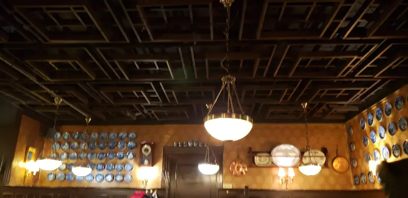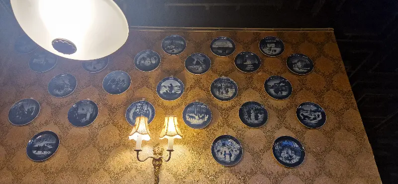 벽에는 푸른색 그림이 그려진 접시들이 빼곡하게 장식되어 있었는데, 자세히 들여다보니 덴마크의 역사와 문화를 담은 그림들이었다. 마치 작은 박물관에 온 듯한 느낌마저 들었다. 천장의 격자무늬 장식과 앤티크한 샹들리에는 공간에 깊이를 더하며, 오랫동안 이곳을 지켜온 세월의 흔적을 느끼게 했다. 전쟁 전 시대를 떠올리게 하는 앤티크한 분위기 속에서, 나는 마치 영화 속 주인공이 된 듯한 설렘을 느꼈다.