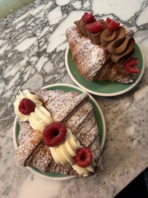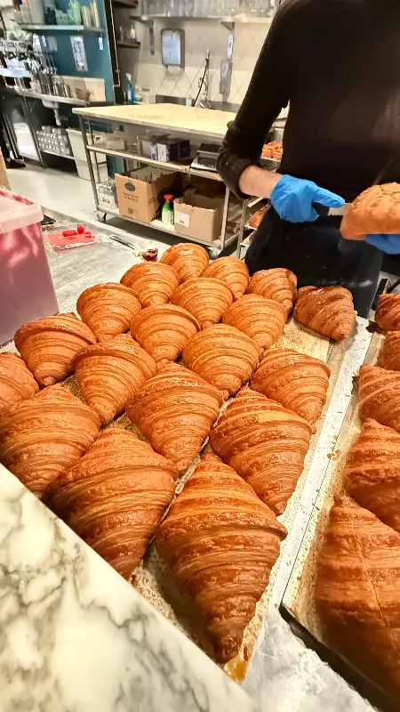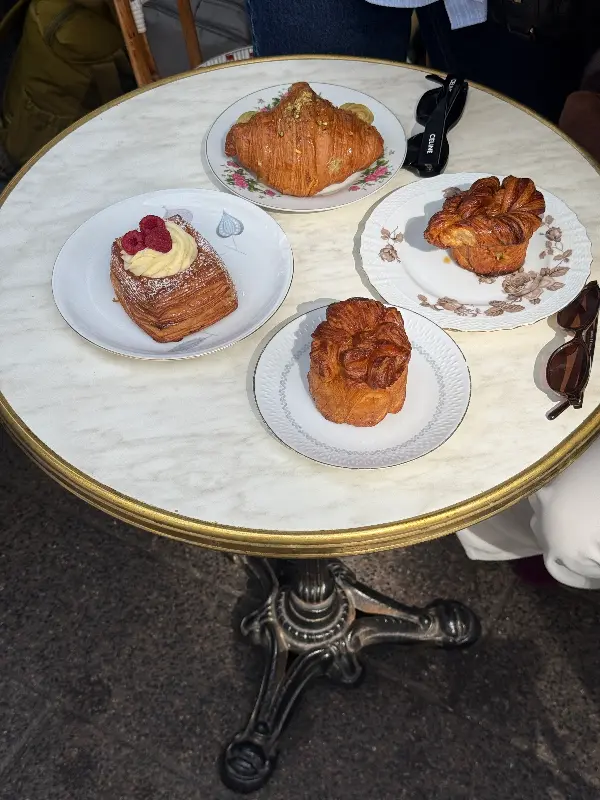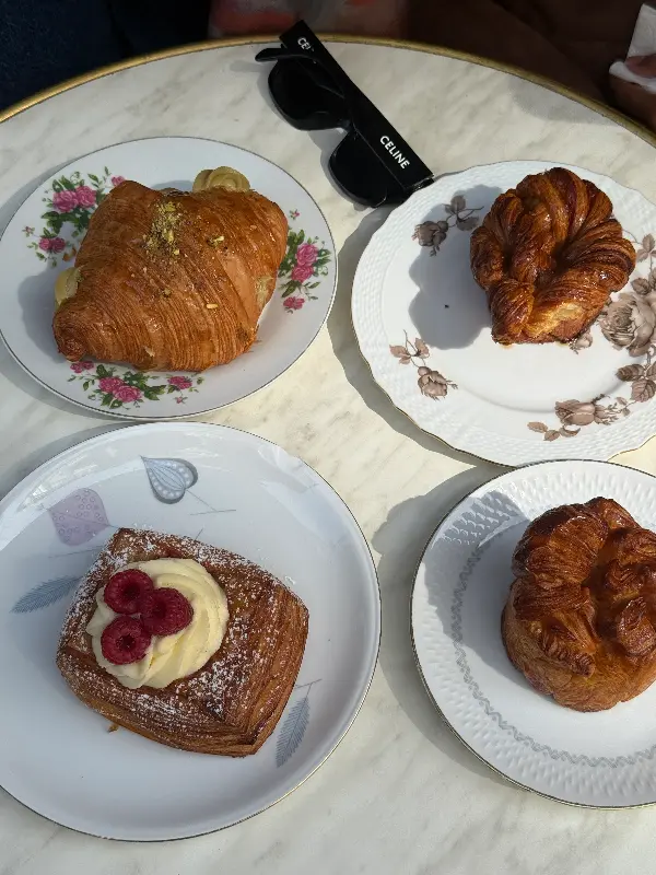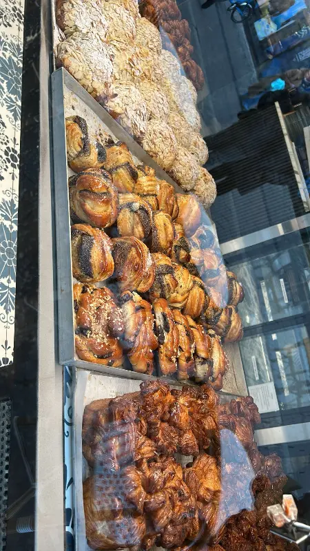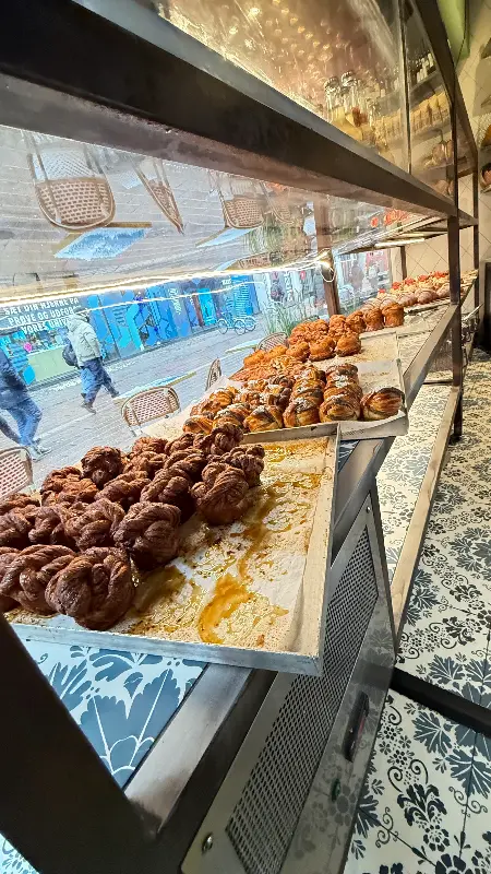 가게 안은 이미 사람들로 북적였다. 테이블은 거의 만석이었지만, 다행히 창가 자리가 하나 남아있었다. 따뜻한 햇살이 쏟아지는 그 자리에 앉으니, 마치 영화 속 한 장면 속에 들어온 듯한 기분이 들었다. 카운터 뒤 진열대에는 갓 구운 빵들이 보기 좋게 정렬되어 있었는데, 그 모습은 마치 예술 작품을 감상하는 듯했다. 버터 향, 설탕 향, 그리고 은은한 커피 향이 섞여 코끝을 간지럽혔다.