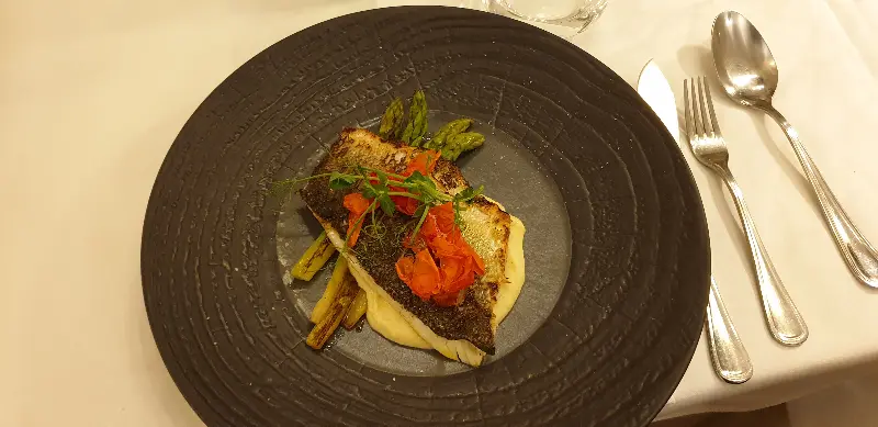 검은색 접시에 담겨 나온 농어 스테이크는 시각적으로도 훌륭했다. 촉촉한 흰살 생선 위에는 잘 구워진 토마토가 올라가 있고, 옆에는 노릇하게 구워진 아스파라거스가 놓여 있었다. 섬세한 플레이팅은 음식의 맛을 더욱 기대하게 만들었다.