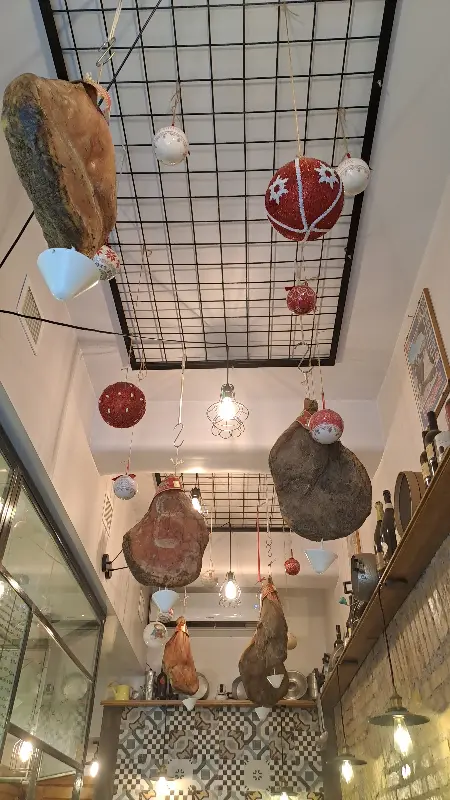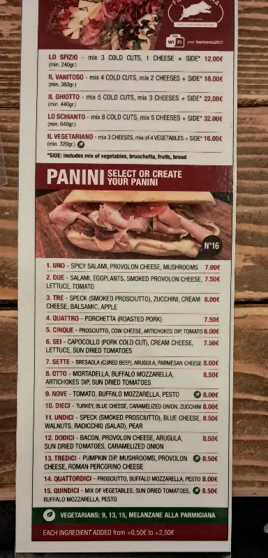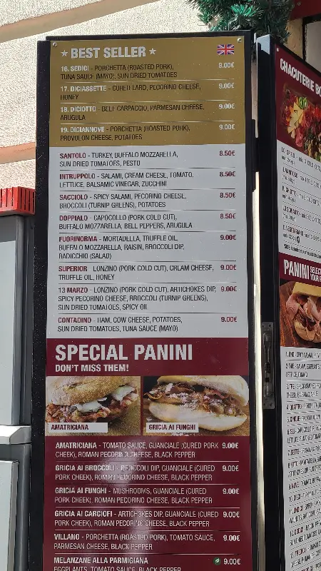 가게 안으로 들어서자, 쇼케이스 안에 가득 찬 신선한 재료들이 시선을 사로잡았다. 붉은 토마토, 싱싱한 채소, 윤기가 흐르는 햄과 치즈… 하나하나 정성스럽게 준비된 재료들에서 느껴지는 신선함은 파니니에 대한 기대감을 한껏 끌어올렸다. 메뉴판을 가득 채운 다양한 파니니 조합은 잠시 고민에 빠지게 했지만, 베스트셀러 메뉴를 추천받아 주문하기로 했다. 쇼케이스 위쪽 벽면에는 손글씨로 빼곡하게 적힌 메뉴판이 정겹게 느껴진다. 천장에는 햄 덩어리가 매달려 있는 독특한 인테리어가 눈길을 끈다.