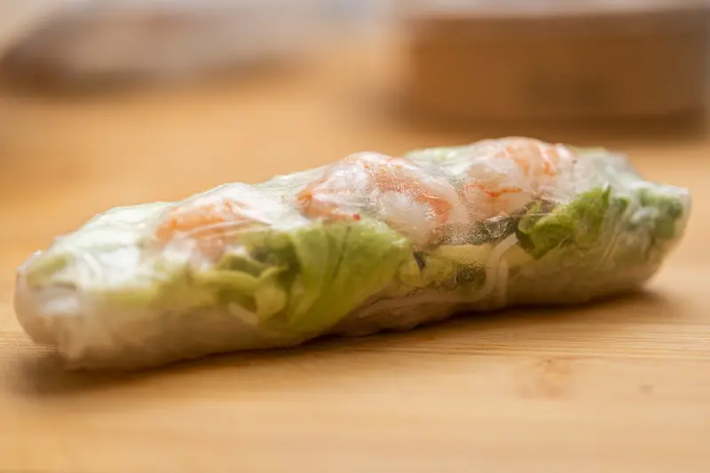싱그러운 녹색 채소와 통통한 새우가 어우러진 롤, 신선함이 눈으로도 느껴진다.