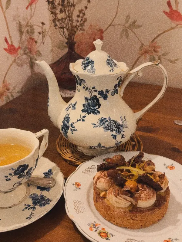 이곳은 차 전문점답게 다양한 종류의 차를 갖추고 있었습니다. 홍차, 녹차, 허브차 등 종류도 다양했지만, 평소 가향차를 즐겨 마시는 저는 망설임 없이 향긋한 과일 향이 블렌딩된 티를 골랐습니다. 잠시 후, 예쁜 티팟과 찻잔 세트가 테이블 위에 놓였습니다. 섬세한 문양이 새겨진 티팟과 찻잔은 마치 예술 작품처럼 느껴졌습니다.